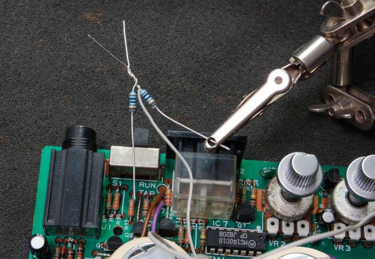 The RUN connection is R10. The CLOCK connection is R16. Both of the 100k resistors (brown black black orange) should be fitted towards the front of the board: