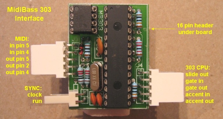 It also has bi-directional connections to the 303's DIN sync signals, so it can either synchronise the 303 sequencer to external midi clock, or generate midi clock output from the 303's internal timebase.