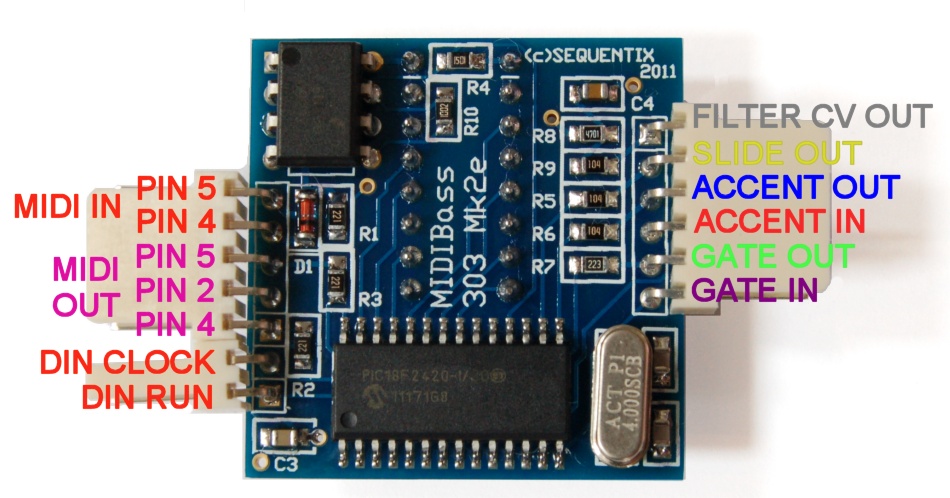 - addition of a capacitor (to fix a sync bug present in the original 303 CPU that only becomes apparent when you generate MIDI clock from its internal timebase)