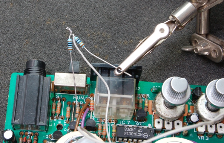 The RUN connection is R10. The CLOCK connection is R16. Both of the 100k resistors (brown black black orange) should be fitted towards the front of the board: