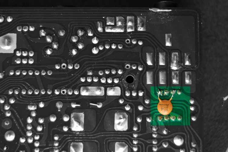 The extra capacitor is soldered to the pads shown here, which are close to the pads for R10 and R16: