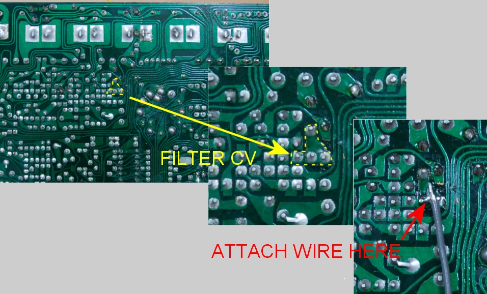 The filter CV connection requires a single wire to be connected to a point in the filter CV mixer circuit on the reverse side of the board.